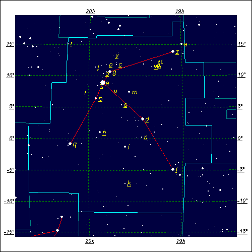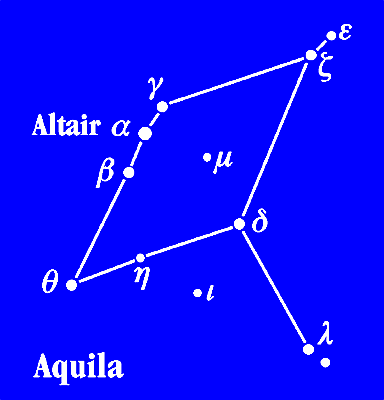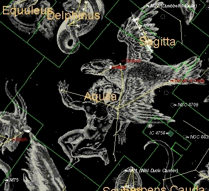 La estrella más brillante de esta constelación es a-Aguila, llamada Altair, estrella de primera magnitud que, de hecho, ocupa el duodécimo lugar entre las estrellas más brillantes del cielo. Es una estrella doble aunque su compañera, de magnitud 10, es tan poco brillante que no se observa a simple vista. Altair se encuentra tan sólo a 16 años luz de nosotros y su nombre, traducido del árabe, significa águila voladora. En la foto anterior es fácilmente reconocible como el punto más brillante en el borde izquierdo de la imagen y hacia la mitad de la foto. Las estrellas b-Aguila, llamada Alshain, y g-Aguila, llamada Tarazed, se observan alienadas con Altair, debajo y arriba de ella, respectivamente. Una vez identificadas la línea definida por estas tres estrellas no te debe ser muy difícil encontrar el resto de estrellas principales de la constelación ayudándote de los esquemas representados en las dos figuras de arriba. Si aún así tienes problemas, coloca el ratón sobre la foto y observa lo que ocurre. Más sencillo, ¿verdad?. Como puedes observar, esta constelación se reparte entre los dos hemisferios, es decir, tiene estrellas situadas en el hemisferio norte (declinación positiva) y estrellas que están en el hemisferio sur (declinación negativa), de modo que el Ecuador Celeste atraviesa la constelación prácticamente por su centro. Altair, junto con Vega (de la constelación Lira) y Deneb